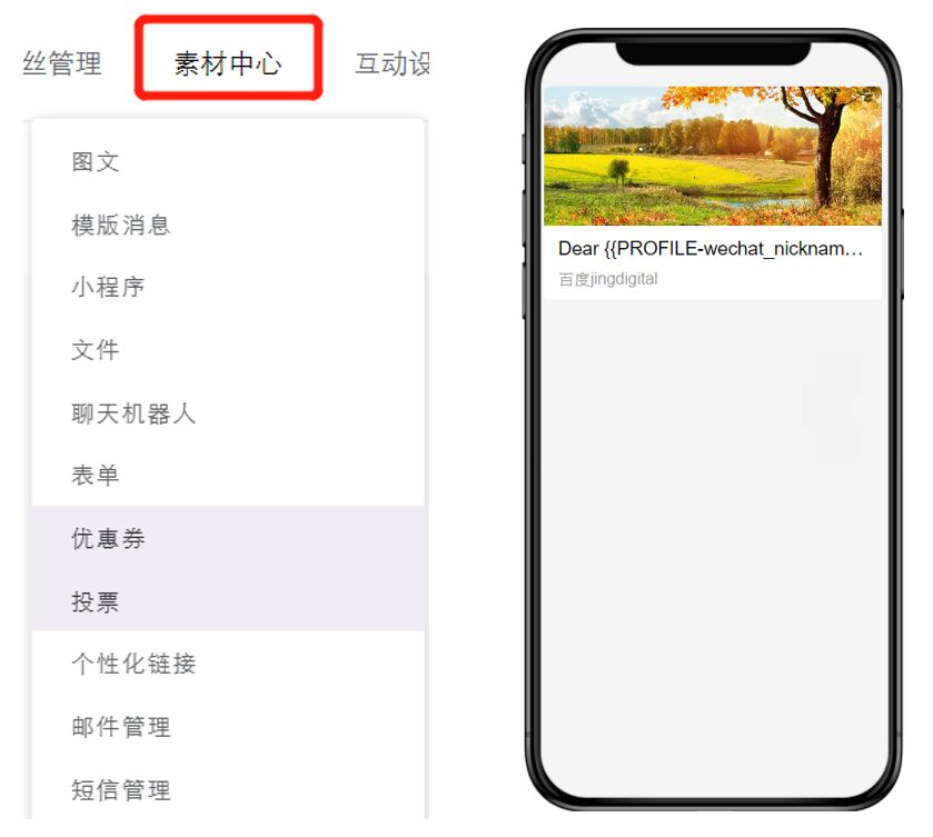 JINGsocial的SCRM管理系统不仅仅升级了微信原有的图文,能够让品牌在微信图文的基础上添加粉丝的个人昵称,还涵盖了个性化模板消息(涵盖粉丝资料字段如昵称、参与活动、行为等,并可设置关键字触发或定时推送)、小程序(通过appid与公众号进行打通)、文件(如pdf文件以供粉丝下载)、聊天机器人(根据粉丝在公众号菜单页面键入的消息进行拟人化对话聊天)、表单(能够在微信环境内完美适配并与数据追踪工具强强联合获取全方位粉丝数据的自定义问卷)、优惠券(帮助品牌在互动的同时键入优惠券,促进购买和转化)、投票(一种更加新颖且更具互动性的内容形式——如对品牌的产品、内容、创意等征及粉丝投票)、个性化链接(可自定义设置的推送链接,帮助品牌对内容进行溯源)、以及邮件和短信的个性化编辑及群发工具。