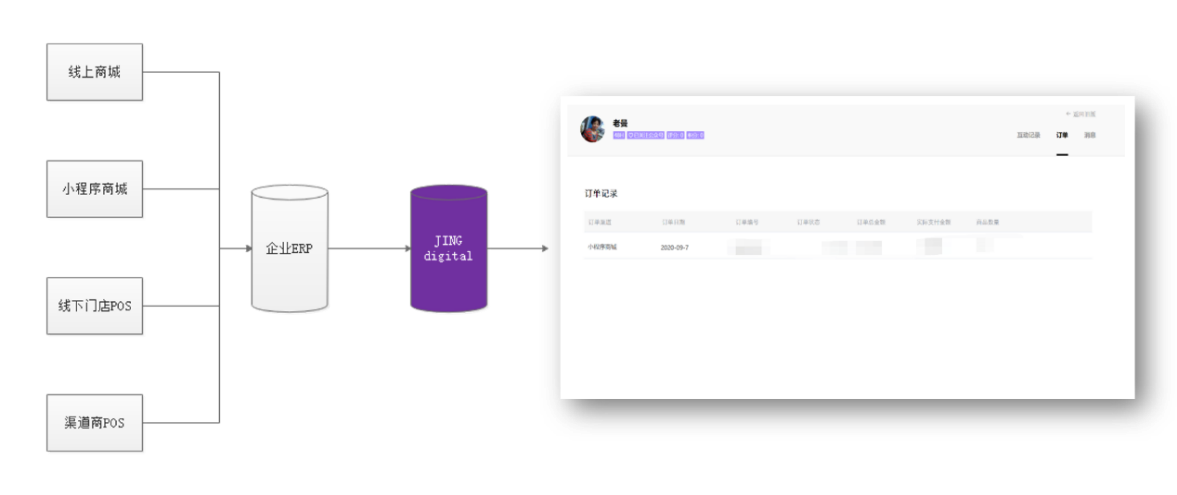 线上线下订单信息流转至企业ERP系统,JINGdigital数据平台借助专有API与企业ERP系统对接,将数据整合至JINGdigital SCRM平台作为品牌的本地数据库,存储用户订单信息,使线上线下订单有据可查,从而满足合规需求。