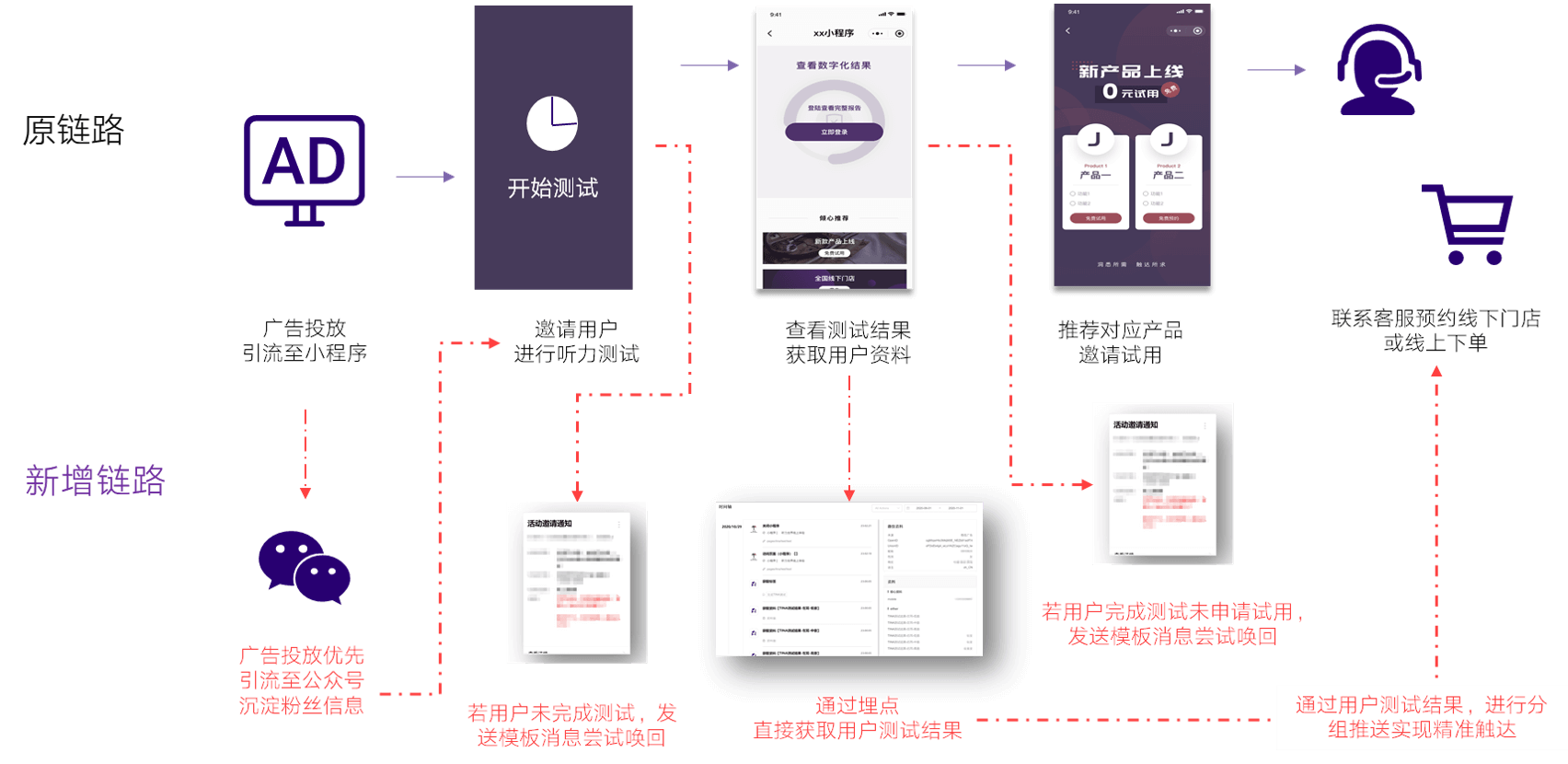 借助JINGdigital营销自动化平台,该品牌实现了在原有的“广告投放引流至小程序——吸引用户进行听力测试——查看测试结果并获取用户资料——根据结果推荐相应产品及试用邀请——联系客服预约线下门店或线上下单”链路基础上,新增“广告投放引流至品牌公众号沉淀粉丝信息”、“唤醒未完成测试用户继续完成测试”、“埋点直接获取测试结果及用户资料”、“唤醒未申请试用的用户”、“根据用户测试结果结合其他维度的用户信息进行精准地分组及推送”五大节点。这样一来,便可以将广告投放的效果最大化,将未成熟的粉丝保存至品牌本地数据库进行长期培育和多次触达,从而对原本极有可能流失的沉默客户实现有效地唤醒。