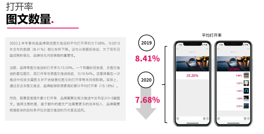 数据调查显示,奢侈品牌推送的所有文章的平均打开率从2019年的8.41%降至2020年的8.03%。热门文章平均打开率为9.73%。很多品牌每次推送只发布一篇文章,但实际上,多篇文章推送的累积打开率明显高于单篇文章推送。因此,品牌方可以充分利用微信公众号的多条文章推送功能,通过用户细分为特定群体创建次条文章,从而在不显著增加成本的情况下使打开率达到最大化。