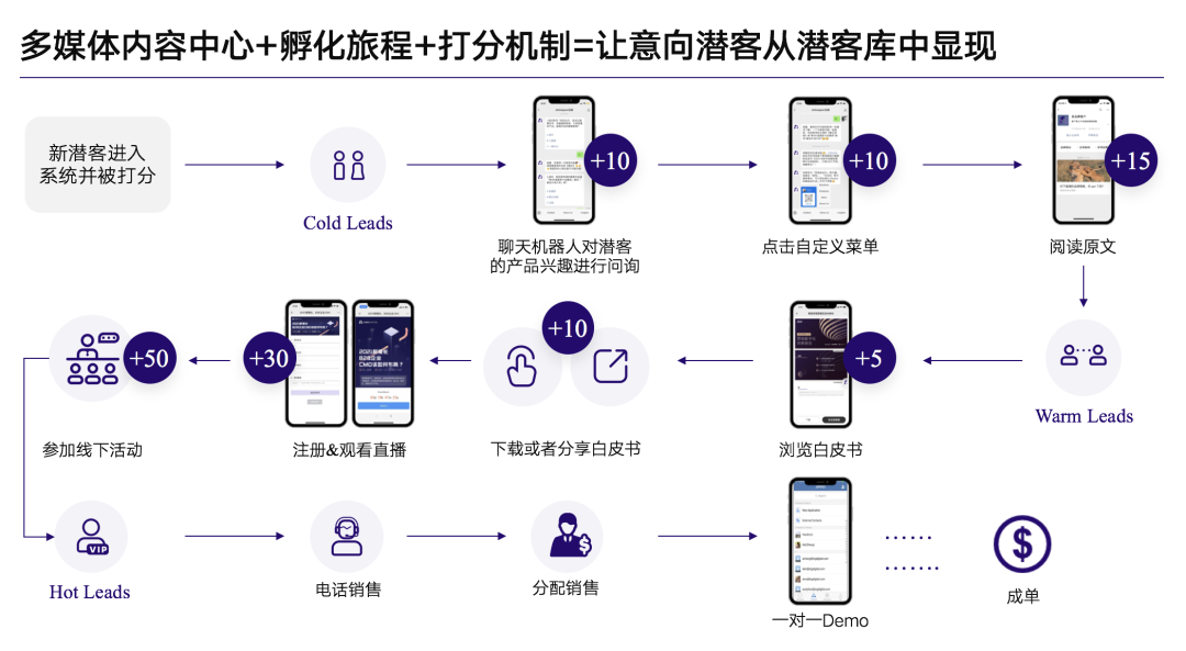 当其活跃度达到一定分值(比如关注+10分,参加产品直播+50分,总计60分),系统则分配该用户资料给销售人员跟进,促成成交。