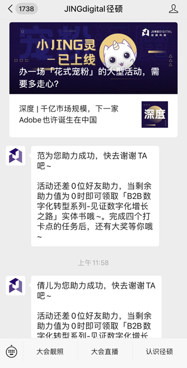 以JINGdigital在7月举办的一场大型数字营销峰会为例,该峰会为到场嘉宾设置了大会专属菜单。通过JINGlead菜单模块设置个性化菜单,并配备专属二维码。到场嘉宾只要扫描关注公众号,即可获得当天峰会专属的定制版菜单,包括“大会靓照、大会直播、认识径硕”三大板块,协助到场嘉宾快速熟悉峰会流程,也有了更好的用户体验。