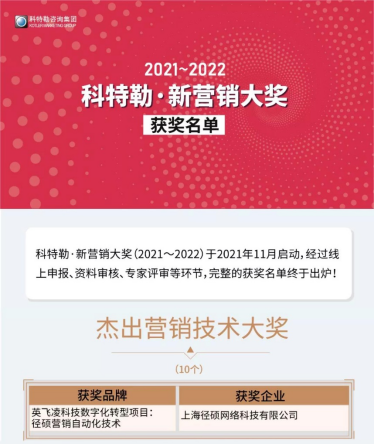 2月16日,科特勒·新营销大奖获奖名单出炉。在众多顶级学术专家、市场营销专家、媒体人历时4个月的层层评选下,上海径硕网络科技有限公司(以下简称径硕科技)从数千家企业中脱颖而出,并凭借客户案例《英飞凌科技数字化转型项目》荣获2021科特勒·新营销大奖杰出营销技术奖项。