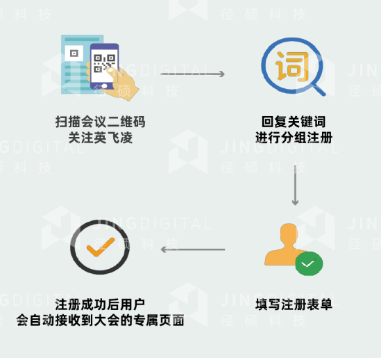 会议邀请发出后,不乏有兴趣的用户打开微信文章并报名,而在未能如约赴会的报名者中,很大一部分的缺席是由非自愿的原因,如忘记会议时间导致的,而这种情况难免令大会举办者和报名者都感到惋惜。英飞凌传播部使用JING平台会议功能,在IPAC大会整个报名期内,有针对性地合理设计用户旅程,制定个性化推送内容触达带有IPAC标签的用户,并在关键流程节点自动发送模板消息进行不同场景的通知,如通过微信在大会倒数四天开始提醒,保证注册用户的参会率。