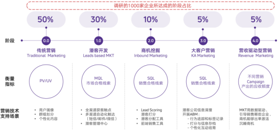 通过服务近400家中头部客户,调研了1000家企业后,径硕科技针对B2B企业数字化提出了“营销驱动型营销”的概念。在该阶段,应用径硕提供的产品,企业可以完成销售线索贯穿用户全生命周期、全漏斗、全角色的数据整合及转化。
