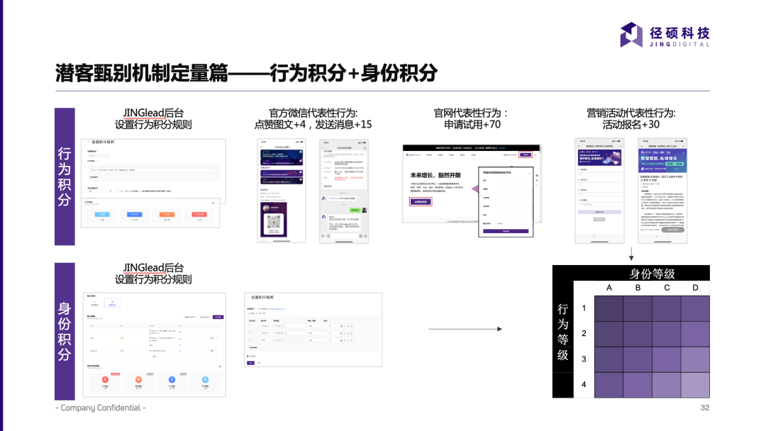 第一个维度是身份维度。基于客户所在行业、公司、规模、地域,以及他的职位及这个职位本身的在角色链条里面的作用,来评判这个客户是不是值得我们去跟进,这是第一个维度。