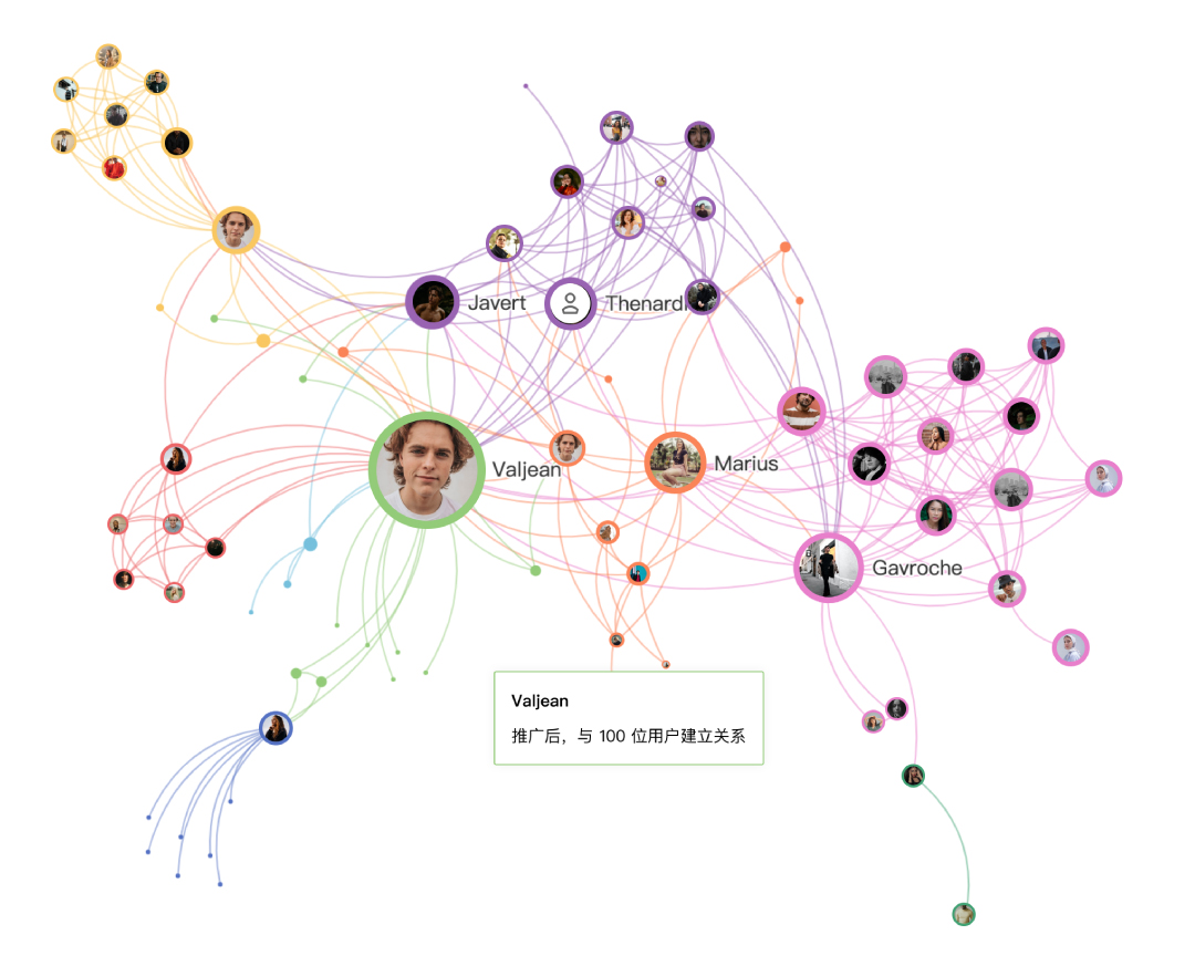 根据这场全员营销活动的「推广者关系图谱」,推广者从参与推广、分享到邀请他人的行为传播轨迹,都被实时生成下方的这张动态关系图谱: