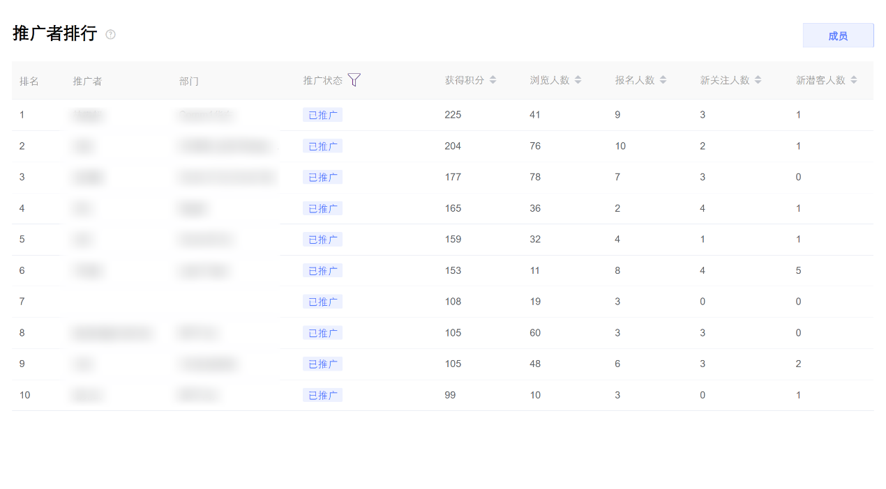 那么在推广者排行名单里,我们还能查看本次活动的推广者排名。运营人员可以借此作为后续激励机制的参考,以便于激发大多数企业成员踊跃参与。