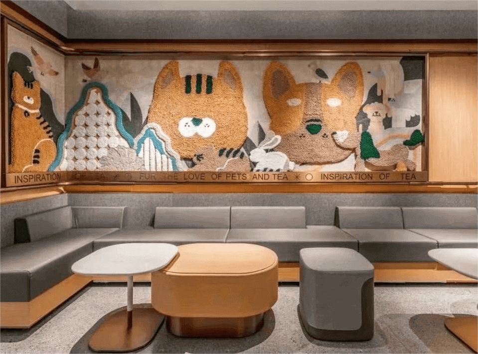 当下,以“宠物”为主题的店数不胜数,但喜茶是第一个布局宠物友好主题店的茶饮品牌。该喜茶主题店划分为就餐区、休闲区和宠物区,店内装修多采用以猫狗为主题的萌宠元素,设计宠物主题的插画,使用户体验舒适温馨,沉浸体验喜茶的宠物文化。