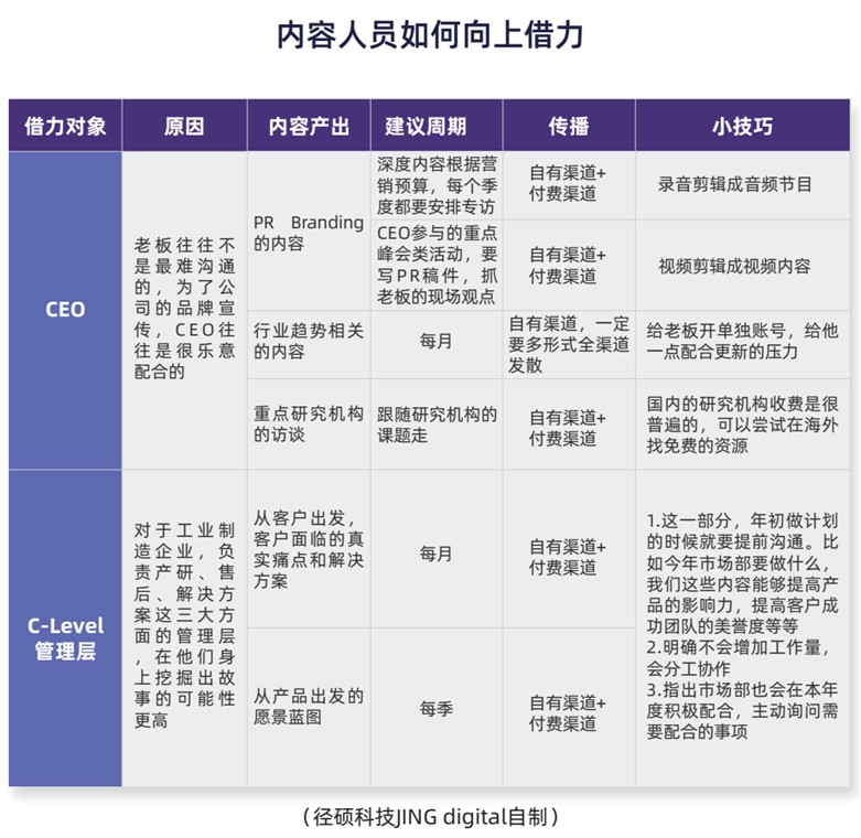 除了CEO,对于工业制造企业而言,负责产研、售后、解决方案的高级管理层也能输出独到的见解。他们相比于CEO来说,更加专精于自己的领域,因此可以挖掘出精细的内容。例如可以向产研高管询问产品相关的知识点,可以询问解决方案高管过往优秀的客户解决案例。不过,这些大佬们的时间可是很宝贵的,需要提前制定计划进行沟通,确保双方都能有时间和精力投入其中,当然市场部需要提供更多支持,为大佬的观点输出扫清障碍。