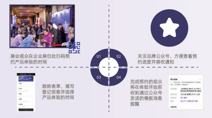在线下展会中,制造企业大多扮演参展商的角色,大量报名观众的数据完全为展会主办方所有,针对这些客户数据,参展企业完全处于被动状态。一个可以扭转局面的做法是,企业通过预约产品体验/产品演示,引导观众关注公众号,将其沉淀到自己的私域流量池中。更进一步的做法是,利用表单收集预约观众的信息,并通过公众号模板消息发送预约提醒。