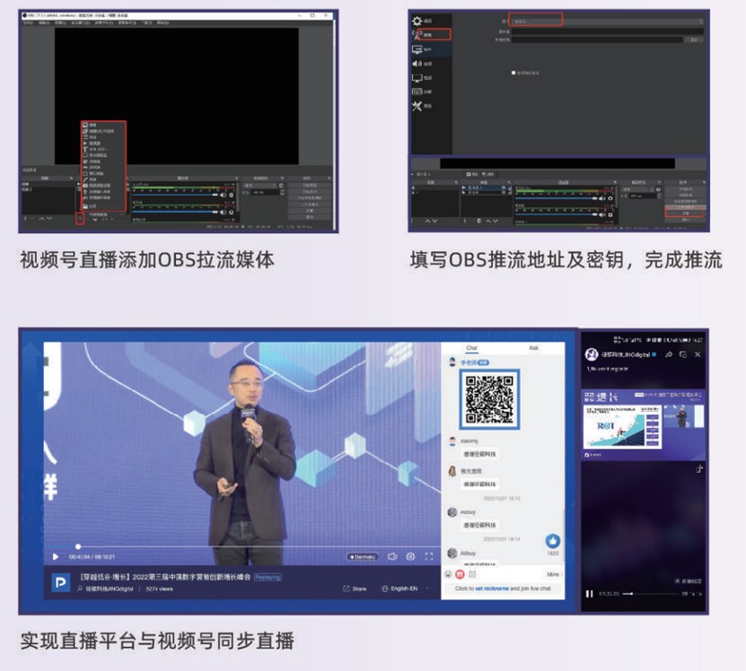 之后在OBS平台完成设置,从第三方平台推流至视频号。具体操作分为两步。具体操作如下图所示: