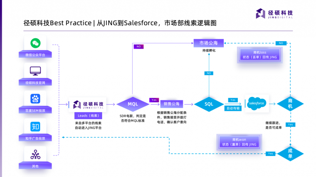 尤其是,随着近几年国内MarTech技术的推进,实现数据从MA到CRM的实时传输的产品需求愈发普遍,尤其是很多已经完成数字化营销1.0阶段的企业。因此,如何打通Salesforce,实现全链路追踪营销?径硕从调研需求到痛点分析,以及最后的产品落地,以此实现跨系统数据的双向传输,支撑起企业的数据中台。