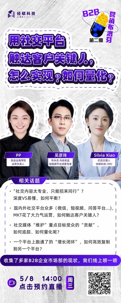 带着这个问题,我翻看径硕连续5年出具的《B2B营销人社交全域运营数据报告》(2024版即将发布),觉得单纯数据尤嫌不够,于是请到两位短视频社交平台、出海企业社交平台操盘手,补全所有社交平台的攻坚克难实战经验,一起探讨: