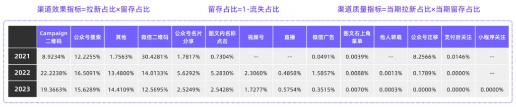 下面我们再来看一组2021-2023公众号一些拉新渠道的效果指标数据: