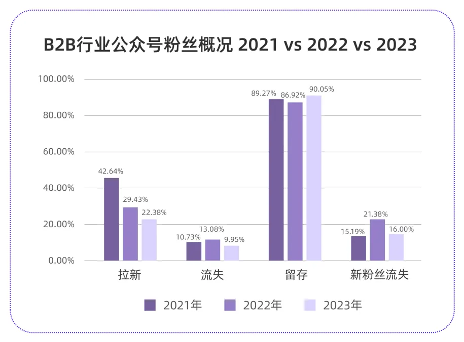 据调研结果发现:2023年,新老粉丝的整体拉新率明显低于2021和2022年,呈逐年下降趋势,但相较前两年,2023年粉丝流失率也是最低,这也意味着公众号这个渠道有很大的保留价值。