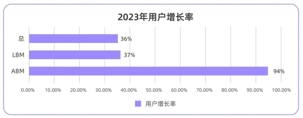 那么如果在预算有限的情况下,到底该如何选择?我们不妨先看一组调研数据:径硕科技通过调研近百家B2B企业发现,2023年这些企业的总用户增长率约为36%,其中实施ABM营销策略的企业用户增长率明显高于LBM,与2022年相比,ABM公司用户增长率达到了94%,而LBM公司也有37%的用户增长。