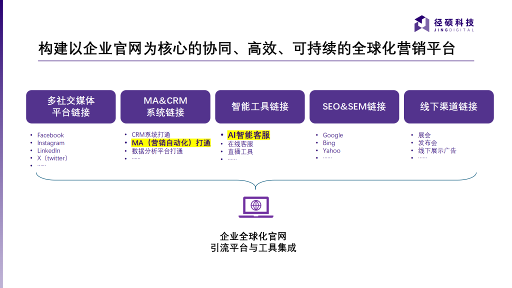 随着全球经济新周期的到来,中国企业出海已成为不可逆转的趋势。然而,面对复杂的国际市场环境,文化差异、市场准入、用户洞察、品牌建设与信任等一系列挑战,中国企业在全球化进程中亟需全球营销资源的整合与数据驱动决策。作为B2B数字化营销领域的创新者,径硕科技近日全面升级B2B出海数字化营销一站式解决方案,助力中国企业在出海营销中破解难题,实现品牌全球化与业务增长的双重目标。