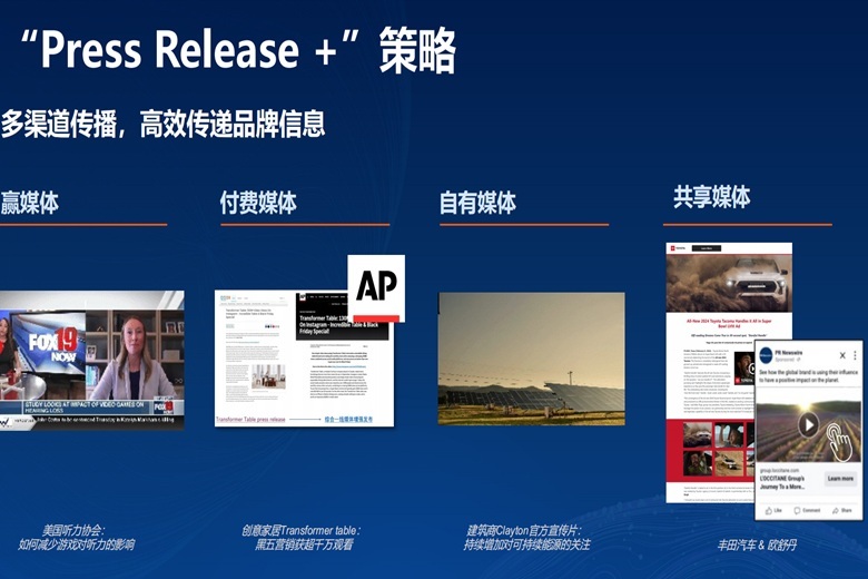 美通社认为,新闻稿是品牌传播中承载品牌价值与核心信息的优质载体。以新闻稿为核心,结合图片、视频等多媒体形式,再通过不同 你渠你道进行分发和放大,即“Press Release+”策略,能有效提升品牌影响力。