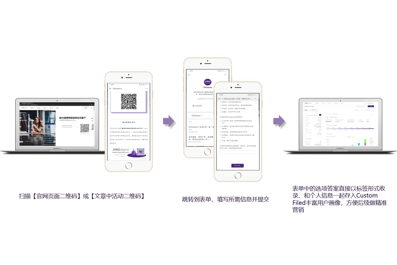 潜客通过官网扫码(或扫文章中活动码)、在H5表单中提交信息,选项中答案及用户所填信息被后台自动存入Custom Filed中。获取更多的用户基本信息,得到更丰富的用户画像,有助于品牌方日后进行精准营销。