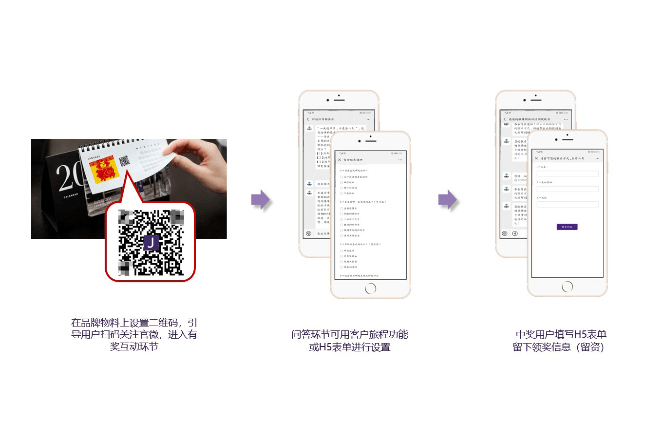 品牌方引导用户扫描物料上的二维码、参与有奖互动问答,最后中奖用户通过H5表单完成留资后领取奖品。