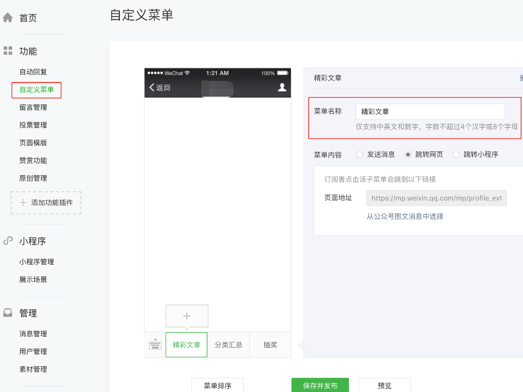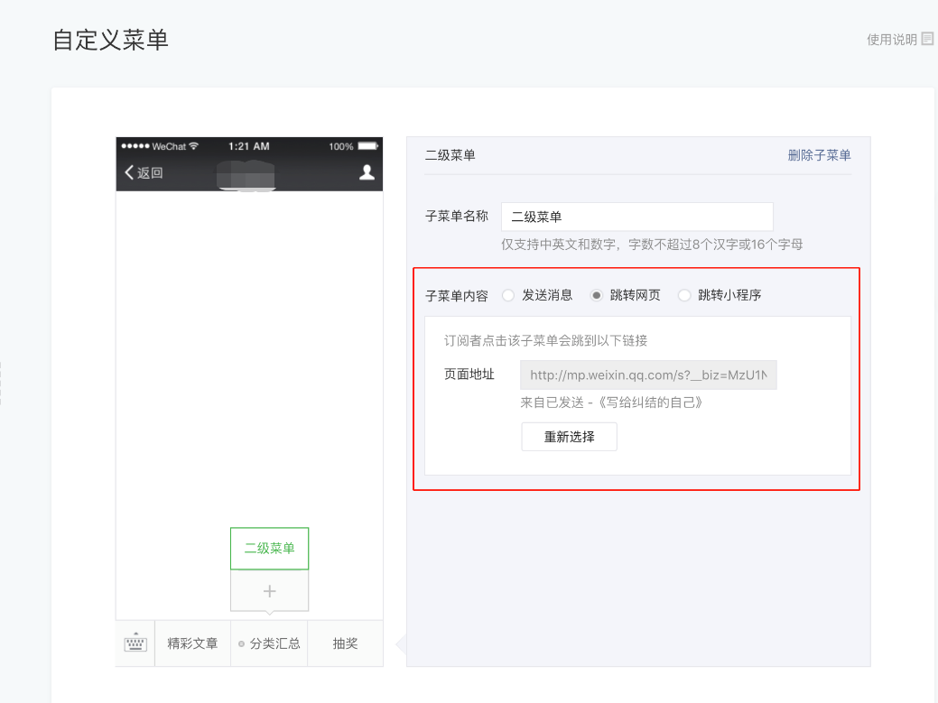 第三步:菜单内容设置跳转网页,输入网页地址。