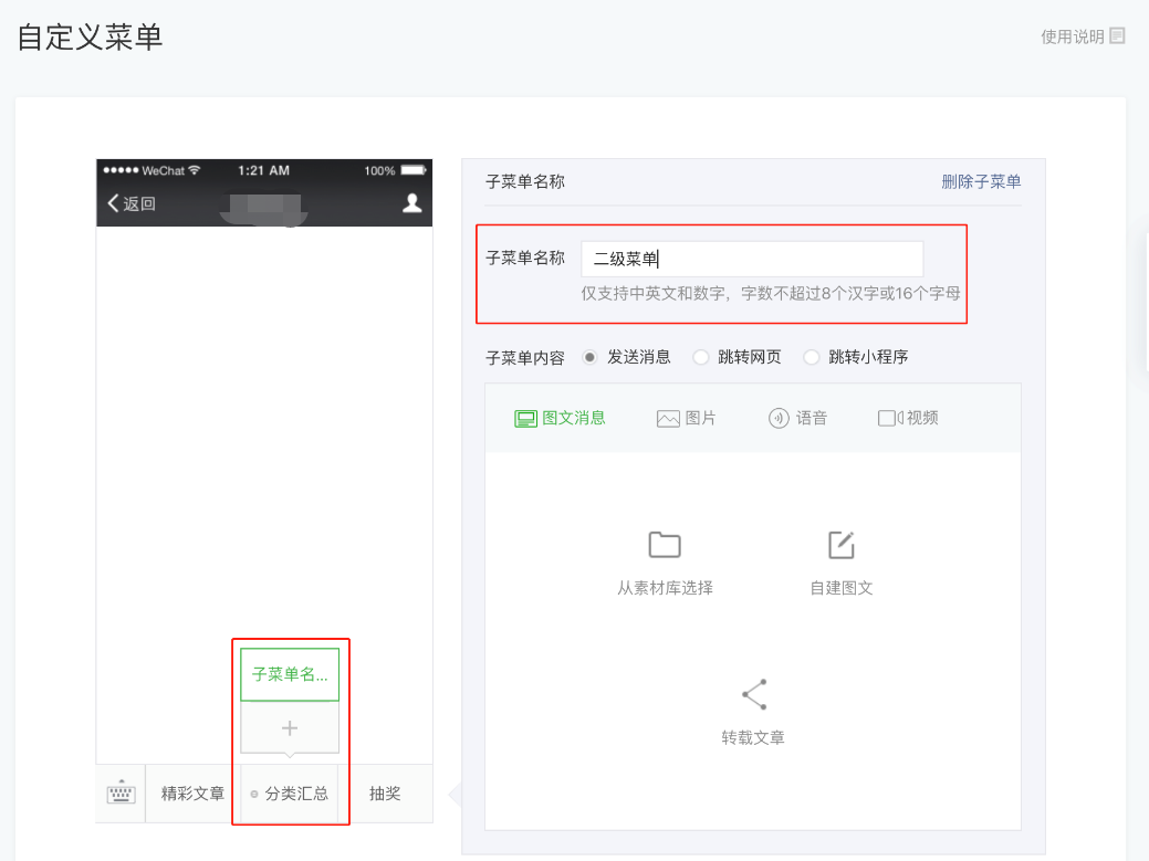 自定义菜单是公众号会话页面中主要与用户产生交互的功能,支持消息发送和页面跳转。自定义菜单可以设置三个一级栏目,五个二级栏目,一共十五个栏目。自定义菜单支持的交互类型有:超链接,图片,文字,图文,语言,视频。