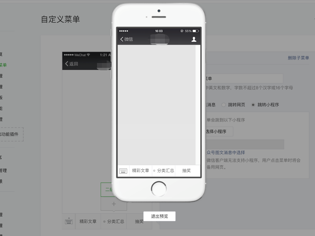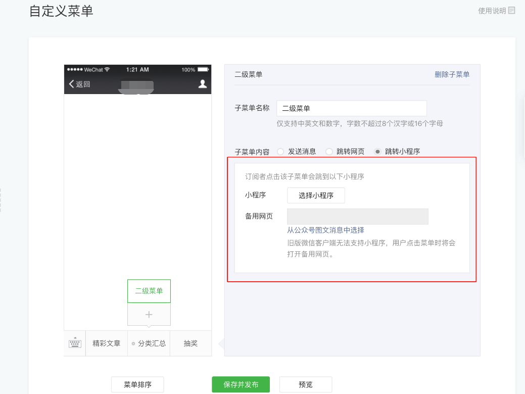 第四步:菜单内容设置跳转小程序,选择小程序。
