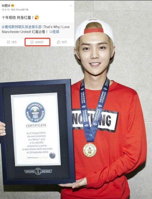 比如,鹿晗的一条微博评论数量达到了4200万以上,并因此获得了“微博上最多评论的博文”吉尼斯世界纪录: