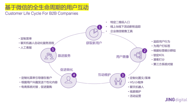 当用户在企业微信后台进行搜索、点击、收藏、回复等动作时,企业也给用户打上了渠道来源、感兴趣内容、互动频率等一系列标签。在营销自动化时代,用户在互联网上的一举一动绝非透明,企业通过技术手段为用户打标签也早已不是什么新鲜事。JINGdigital了解到,随着获客成本的增高, B2B企业微信营销到底怎么做成了困扰许多B端企业的问题。