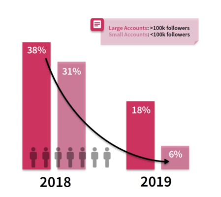 自2012年微信公众平台上线,经过数年的高速增长,目前微信公众平台已进入增长趋缓期。从2019与2018年的整体情况来看,粉丝体量10万以上的账号年均增长量已从38%降至18%,体量在10万以内的公众账号,年均增长量也出现了从31%到6%的大幅度下滑。