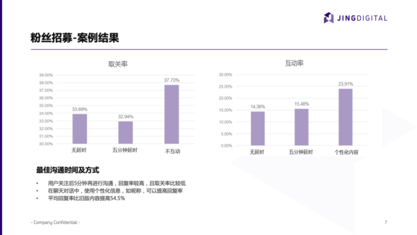 从这个案例我们可以得出结论:用户关注5分钟后互动效果更佳,另外,在会话中加上昵称等个性化信息,用户的平均回复率会比没有任何个性化信息时高54%,所以适当的沟通时机与互动内容是让粉丝愿意互动并保持粘性的有效方式。