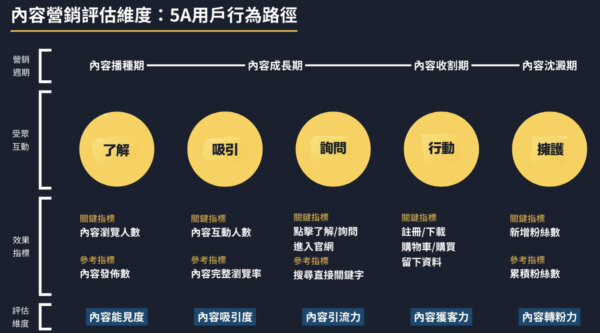 做B2B内容营销,如果能产出10W+的阅读却带不来20+的线索留资,那么这种内容的产出一定偏离了B2B企业的方向,我们以5A用户行为路径为区分,从「Aware了解」到「Appeal吸引」,通过内容播种大范围的扩大内容能见度,吸引更多的浏览人群,相应的这一阶段我们更重视内容的发布数量和最终引流而来的用户数量。从「Ask询问」到「Act行动」,内容也随着互动率的提升和完整浏览率的提升,从成长期跨越到收割期,这一时期,用户留资或申请试用的数量都会加大,这一阶段考验的就是内容的引流能力和获客能力。在最后一个阶段「Advocate拥护」期,内容的获粉能力是用户对该企业的无形认证,在二次传播上给了B2B企业免费的传播声量。