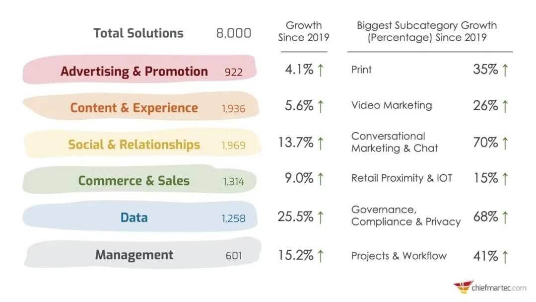 此次公布的2020 版MarTech市场全景图囊括了8000个技术解决方案,这个数字与去年相比上升了13.6 %。从板块划分来看,仍然有「广告与促销(Advertising & Promotion)」「内容与体验(Content &Experience)」「社交与关系(Social & Relationship)」「商务与销售(Commerce & Sales)」「数据(Data)」「管理(Management)」6大板块。