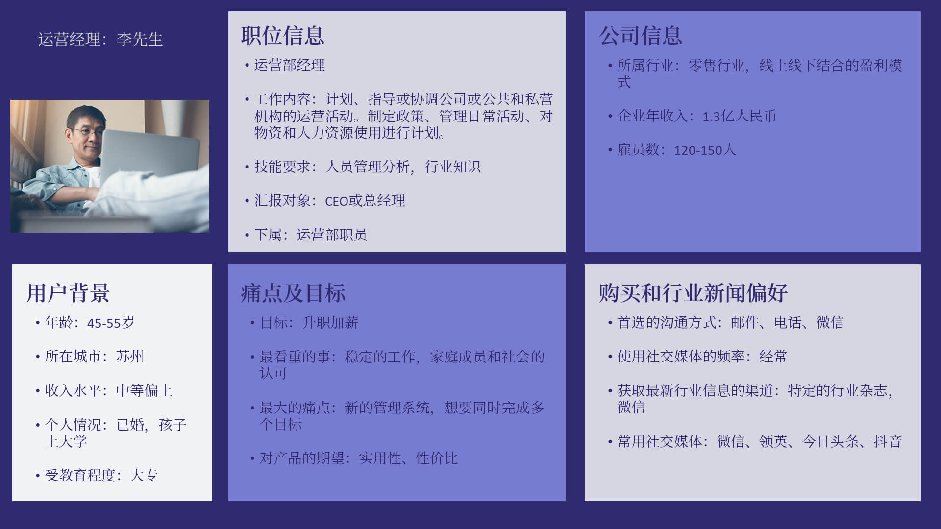 上图展示了B2B行业营销的一种用户画像案例,适用于软件销售或管理信息系统销售行业。通过图片,我们可以清楚的了解李先生的各种信息,以此了解同类型目标受众的特点。通过分析相同行业或相同岗位目标受众的用户画像,了解他们的生活方式、行为方式以及价值观,完善营销策略,对不同的目标受众实现精准营销,提升营销转化率。