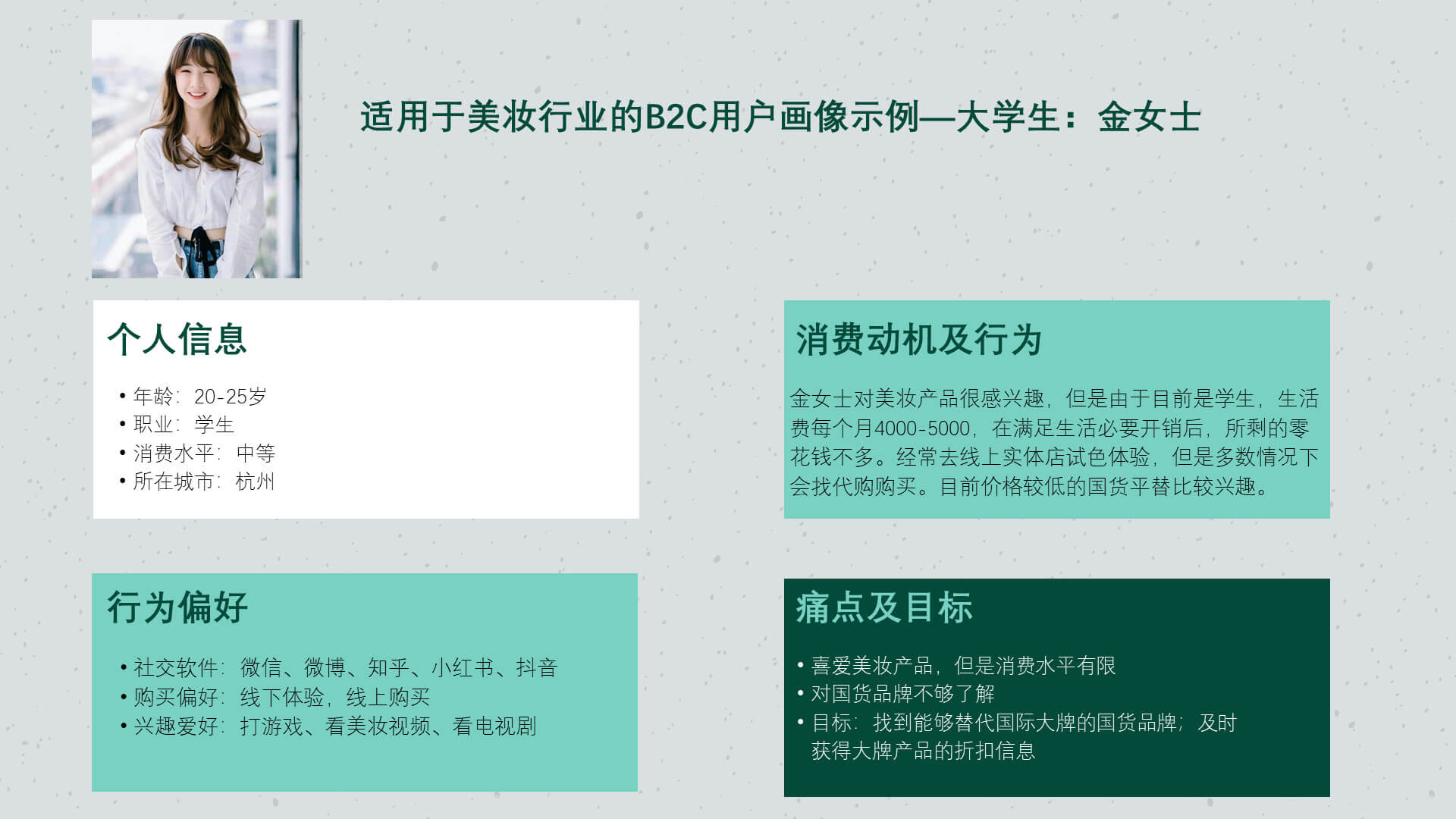 图二通过美妆行业的用户画像进行举例分析,品牌能够进一步了解与金女士相似用户的行为偏好、消费动机和需求痛点等。针对这些信息品牌可以选择恰当的营销渠道和营销内容,创建良好的品牌形象,提升品牌知名度,再通过不同的形式传递给消费者。