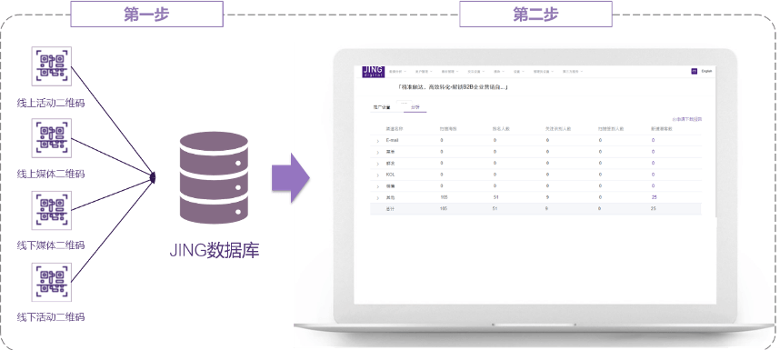 - 打通微信公众号、小程序以及企业第三方使用数据,通过JING带参二维码将各渠道潜客数据引流至官微,沉淀用户行为数据、活动效果数据到JING平台;