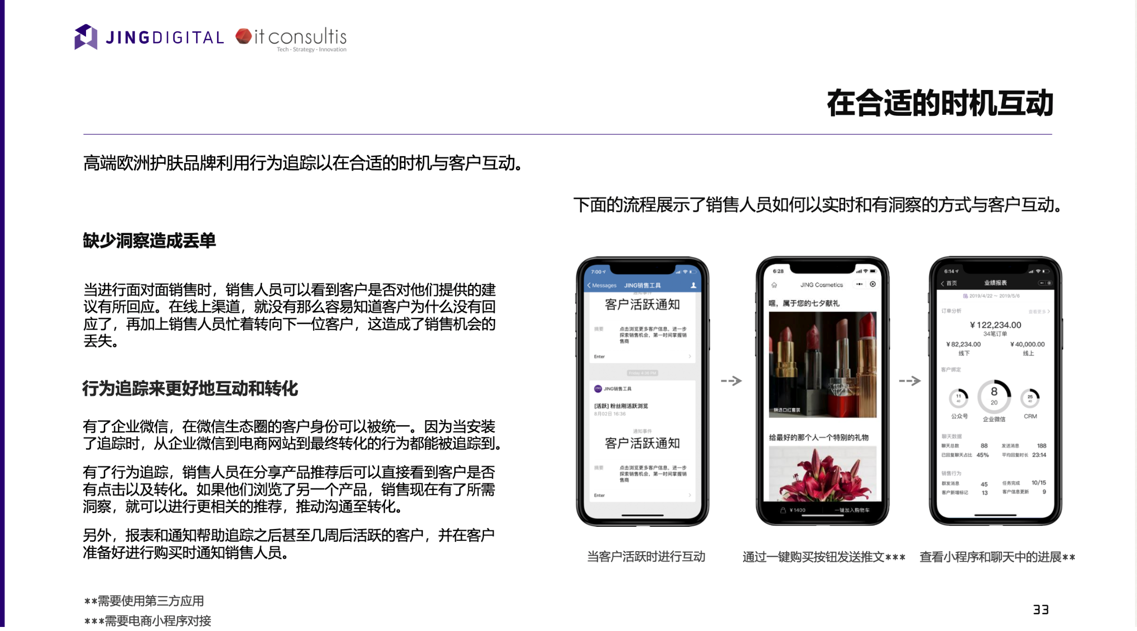 如果销售人员在「企业微信」这款APP中记录的客户或潜客关注了品牌微信公众号,通过JINGdigital SCRM打通企业微信与公众号用户数据后,这一部分用户在公众号、微商城内产生的高价值行为都会被记录下来,销售部成员可收到跟进提醒。这种场景非常适用于快消零售企业,当门店销售用企业微信添加客户之后,如果客户多次点击公众号某篇图文、多次分享某篇图文、在微商城存在加购动作等,销售都能收到提醒,可以在最合适的时机进行潜客跟进!
