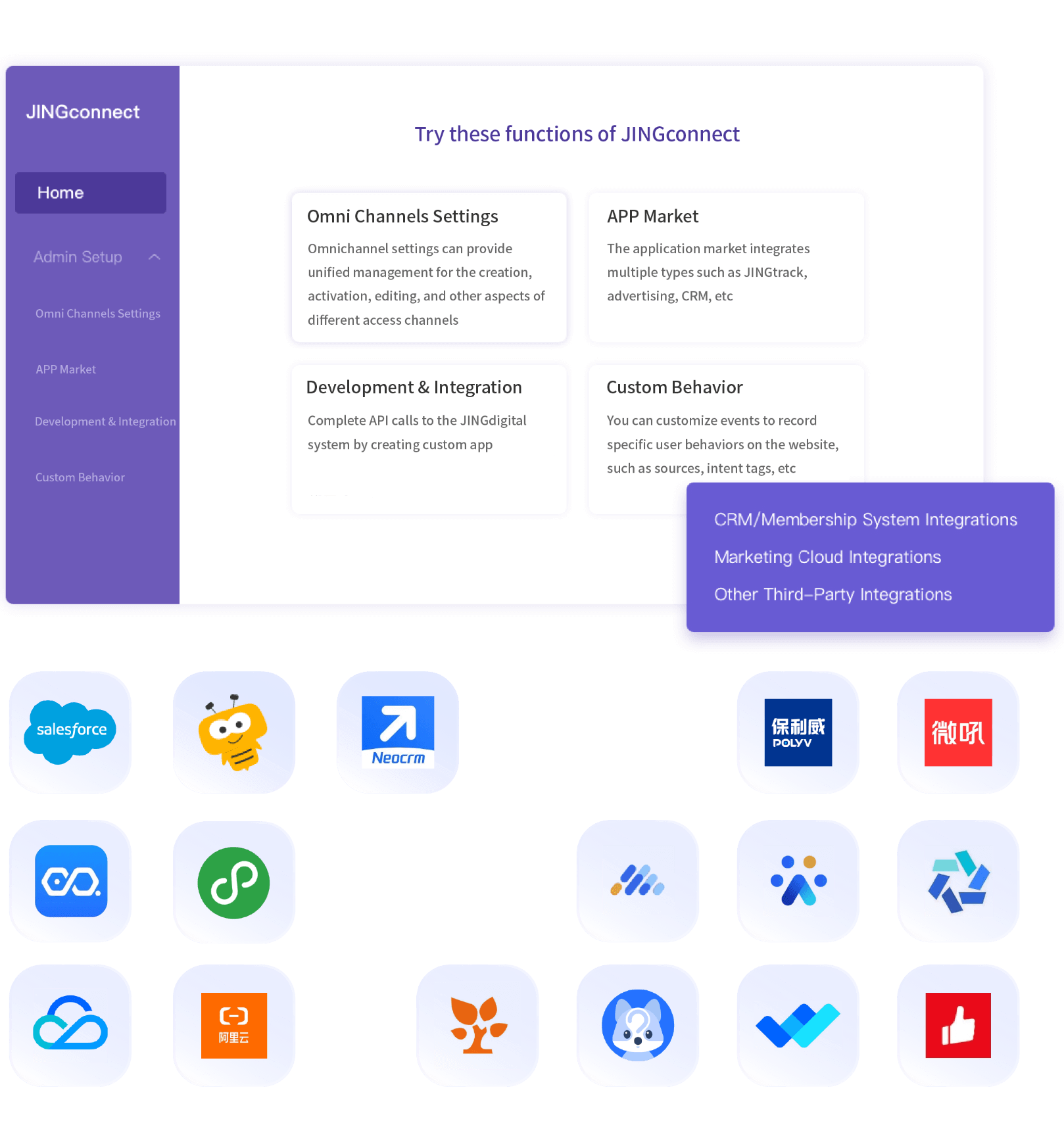 Connect all your systems to create an integrated solution. Whether it's Salesforce, HubSpoto or Zoho CRM you can use standardized connectors to quickly connect your current CRM and other marketing tools with JING.