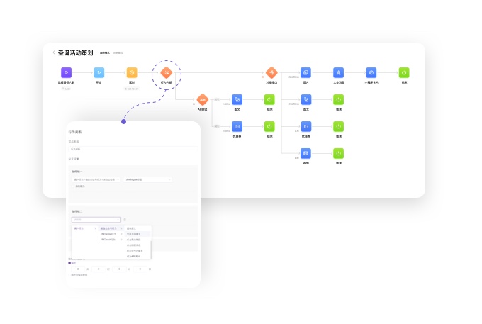 我们以不同的营销触点为起点,帮助您实现各大获客渠道与会员系统、自建电商平台之间的打通,从而做到针对用户所处的生命周期,根据不同的用户行为触发智能聊天机器人等互动功能,推动用户购买的进程。您只需设置规则,系统便能自动化执行,完成与用户的实时互动。互动过程中,您能实时监测用户数据,持续优化策略。