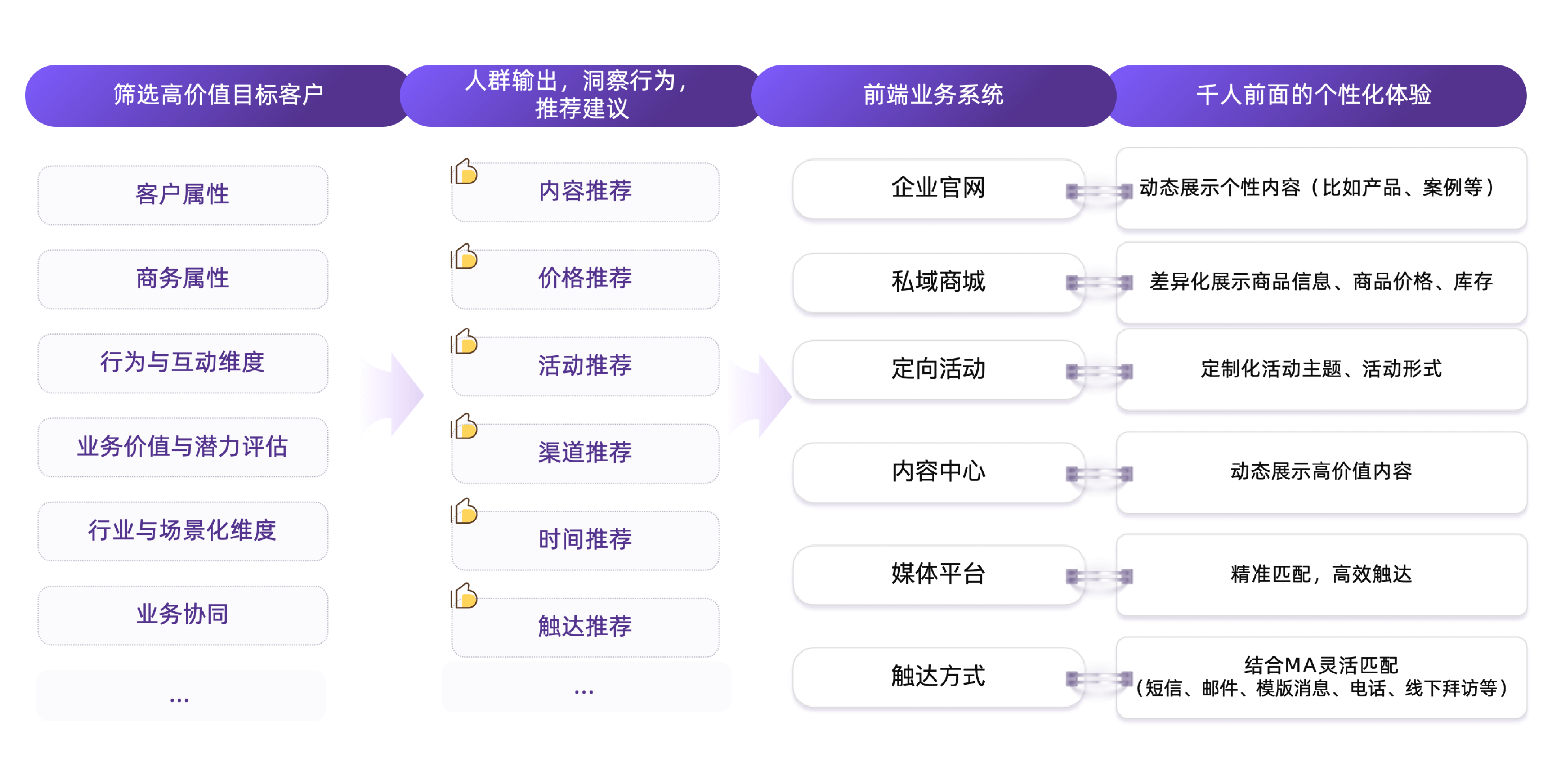 - 高价值客户筛选:基于客户属性(行业/企业规模)、商务属性(采购预算/历史记录)、行为互动(内容偏好/活动参与)构建多维度评分模型,精准锁定高潜客户; - 智能策略推荐:AI生成动态内容、价格方案、活动形式及触达节奏; - 前端业务联动:官网/小程序/公众号等动态展示差异化内容(产品方案/案例库/价格策略),实现“千人千面”精准触达; - 效果反哺优化:实时追踪客户互动数据,自动迭代推荐模型。