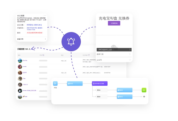 针对未留资的粉丝、已留资但未有明确意向的潜客、高意向潜客、沉睡潜客等处在生命周期不同阶段的用户,您可以应用线索培育引擎,根据用户群组标签,通过客户旅程、聊天机器人、个性化菜单、智能客服等JINGdigital平台功能,设置针对不同潜客群体的定制化用户培育旅程,精准洞察用户对品牌感兴趣的窗口期,及时跟进直至其完成在线购买或进入线下合作洽谈。